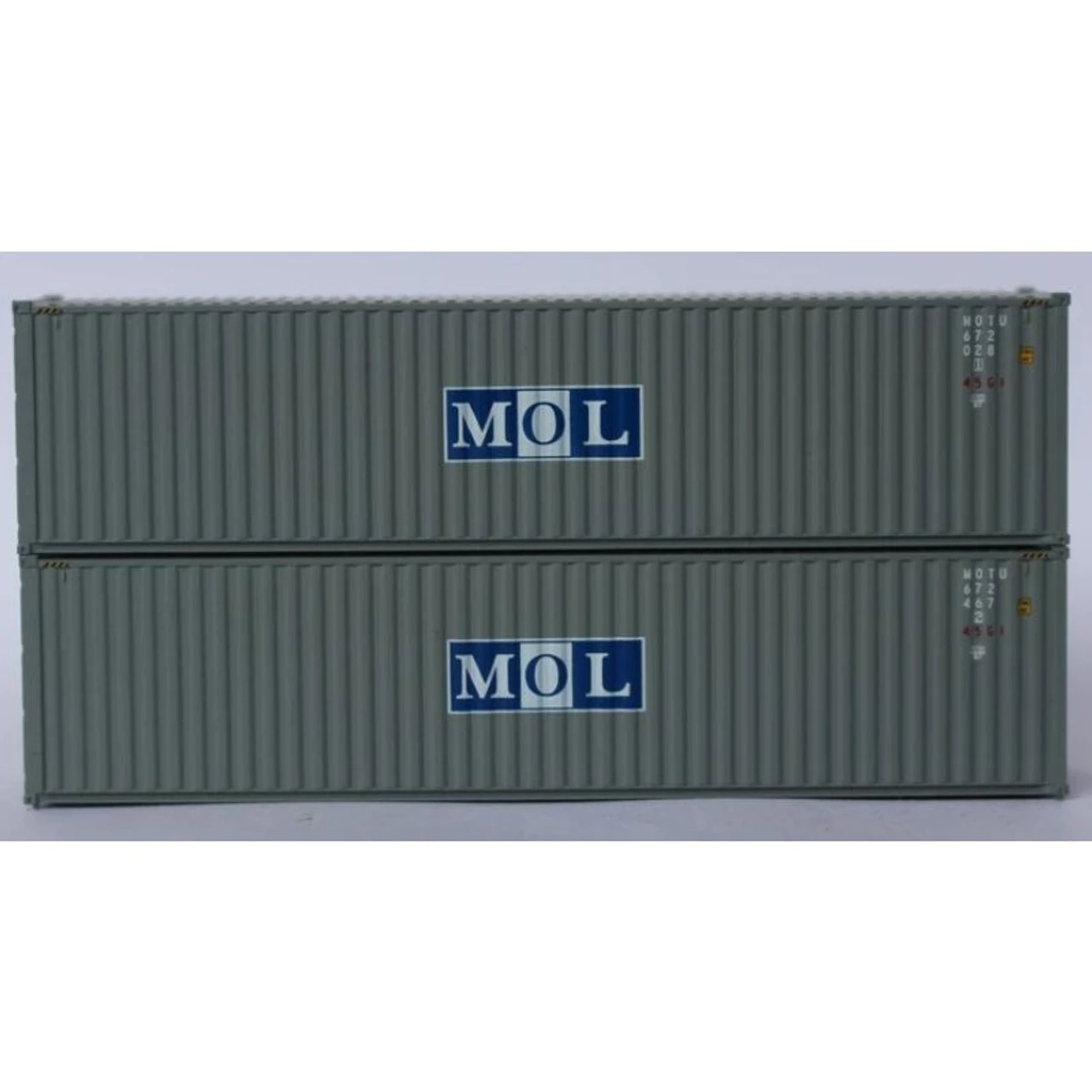 Features; All New Tooling; -42- corrugated sides Seven different door variations tooled: molded as appropriate. See document HERE /Added 2 more door types – Now 9 Total door styles for the 40′ HC container. IBC(Inter-Box Connecting pins) in scale ISO locations JTC Magnetic connecting system: 3-magnets bottom & metal top plate Detailed printing as per photographs Models come in packages of TWO, unless noted otherwise. The IBC pins Mate with JTC 40′ open top containers with Magnets, JTC 20′ containers with Magnets; Atlas 40 container, JTC Flatrack containers, JTC 53′ and 48′ containers and future Jacksonville Terminal Company containers. Compatible with JTC Retro-fit underframe kits to stack M-T and S-T brand containers on top. Jacksonville Terminal Co N Scale MOL GRAY-Initial logo – 40′ HIGH CUBE containers with Magnetic system, Corrugated-side