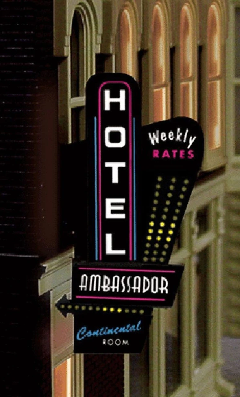 Hotel - Left Hand VerticleAnimated Sign N/HOMiller Engineering Miller Engineering’s line of animated LIGHT WORKS neon signs are created from the same thin (.010″) Electroluminesence material as their non-animated signs with all the benefits and more. These state of the art lighting technology that has never before been available to the modeler. Each kit is pre-programmed with 46 different chase pattern allowing the user to choose the pattern they want. Once a pattern is chosen it is stored in memory and is remembered each time the sign is turned on again. Chase pattern can be changed over and over again.LIGHT WORKS animated signs come in two types; Verticle signs that are designed to be used on the sides of buildings and Horizontal signs that are for the roof tops of buildings. Animated signs draw 180 ma. All kits come with a 2 AAA battery holder.AC Adapters and converters are also available