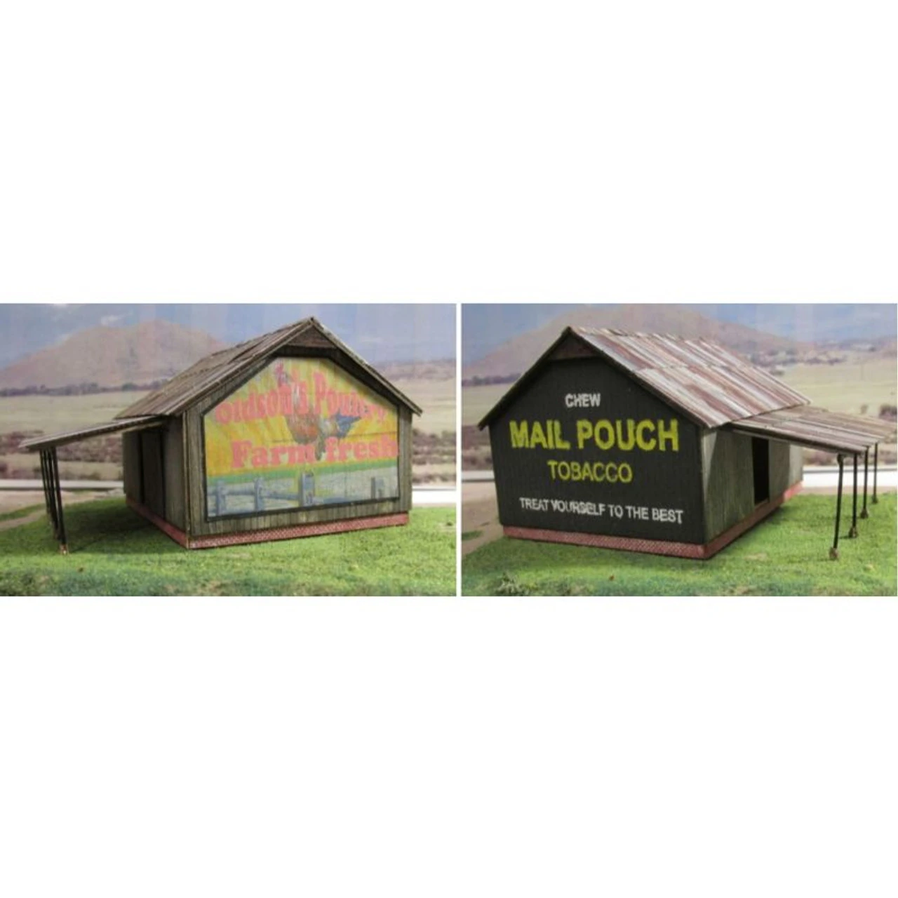 A small rural barn that can be found most anywhere. Kit includes the lean-to, foundation, signs for the poultry end, and a stencil for the Mail Pouch sign. All other material to built it but Glue a paint.
