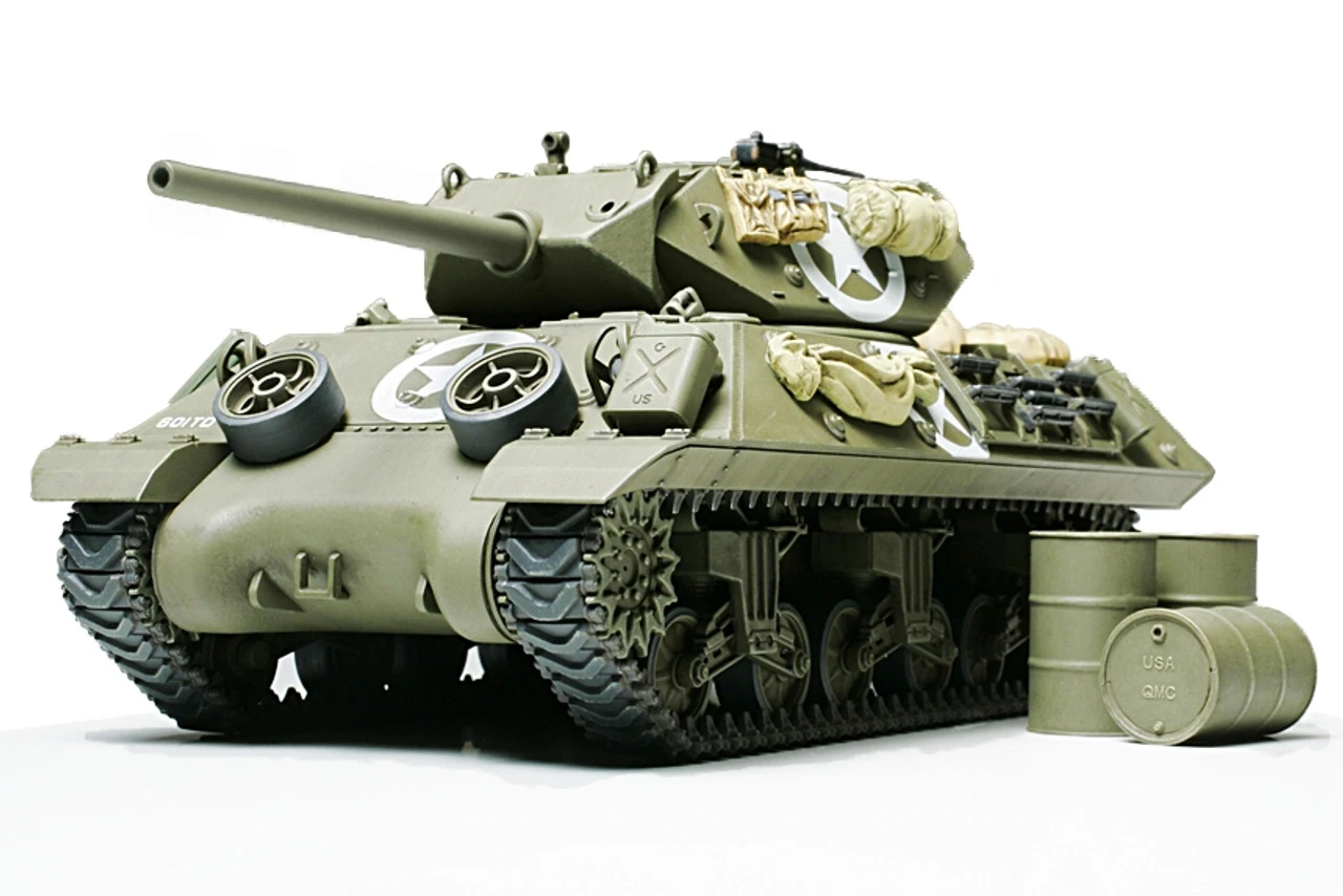 ★Plastic assembly model accurately captures angled hull armor and distinctively wedge-shaped turret. ★Open turret offers view of 76.2mm cannon’s loading device and combat compartment, all finished in realistic and impressive detail. ★Includes both press-type and perforated road wheels and idler wheels. ★Vehicle-loaded equipment and heavy caliber M2 machine gun included as separate parts. ★Comes with U.S. style Jerry cans and 3 types of markings.