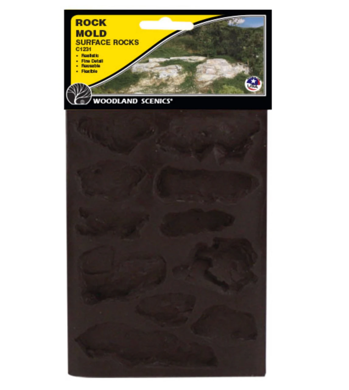Use this mold to make flat rocks for riverbeds, plateaus and road cuts. Mold is flexible and reusable. 5″ x 7″ (12.7 cm x 17.7 cm)  About Rock Molds, Ready Rocksâ„¢, Custom & Debris Model any rock from anywhere. Cast or carve your own; install ready-to-go, hand-painted rock; and pile debris under rock faces and along road cuts.  INSTRUCTIONS Make rock castings with desired Woodland Scenics Plaster (C1201, C1180, C1198, C1199). Prepare plaster following package instructions. Spray mold with “wet water†(mix 2 drops liquid soap in 1 cup water), then pour plaster into mold and tap lightly to dislodge bubbles. Support underneath mold or around edges to keep level. Let set approximately 40 minutes (let small/thin castings dry in mold overnight), then remove from mold carefully. Let castings dry overnight before coloring. ATTACHING ROCK CASTINGS 1. Attach rock castings with Lightweight Hydrocal® Plaster (C1201), Shaper SheetTM Plaster (C1180), wadded Plaster Cloth (C1191-C1193, C1203) or Scenic GlueTM (S190). Test t rock castings in desired location. You may need to cut into your terrain for a proper t. Soak rock casting in water for 10 seconds and brush terrain with water where rock will be attached. When usingLightweight Hydrocal or Shaper Sheet Plaster as an adhesive, mix plaster to a paste-like consistency. Apply adhesive onto backside of rock casting and hold in place on layout until setting begins. Try to keepadhesive off the rock face or it will lose some of its rock-like detail. Fill gaps with one of the above listed plaster products. Let dry in place for 24 hours. Color with Earth ColorsTM Liquid Pigment (C1215-C1223) Refer to The Scenery Manual (C1207) or woodlandscenics.com How-to Videos for more information on attaching and coloring castings.