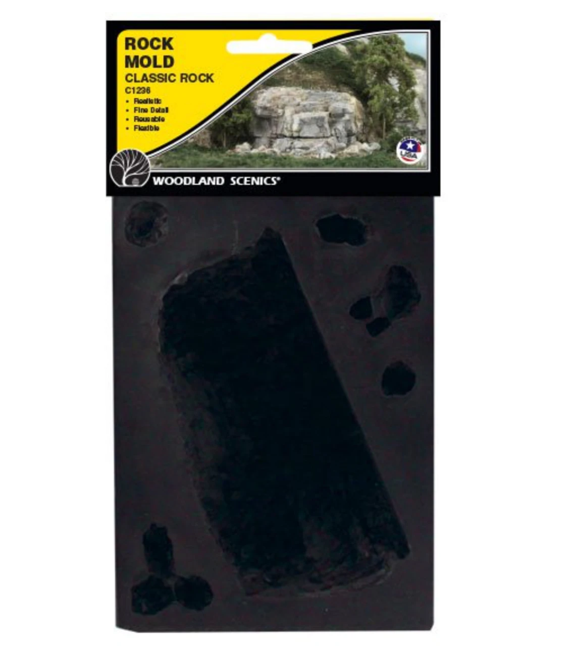 Use this mold to make rocks for road cuts, embankments, ditches and anywhere large rocks might surface. Mold is flexible and reusable. 5″ x 7″ (12.7 cm x 17.7 cm)  About Rock Molds, Ready Rocksâ„¢, Custom & Debris Model any rock from anywhere. Cast or carve your own; install ready-to-go, hand-painted rock; and pile debris under rock faces and along road cuts.  INSTRUCTIONS Make rock castings with desired Woodland Scenics Plaster (C1201, C1180, C1198, C1199). Prepare plaster following package instructions. Spray mold with “wet water†(mix 2 drops liquid soap in 1 cup water), then pour plaster into mold and tap lightly to dislodge bubbles. Support underneath mold or around edges to keep level. Let set approximately 40 minutes (let small/thin castings dry in mold overnight), then remove from mold carefully. Let castings dry overnight before coloring. ATTACHING ROCK CASTINGS 1. Attach rock castings with Lightweight Hydrocal® Plaster (C1201), Shaper SheetTM Plaster (C1180), wadded Plaster Cloth (C1191-C1193, C1203) or Scenic GlueTM (S190). Test t rock castings in desired location. You may need to cut into your terrain for a proper t. Soak rock casting in water for 10 seconds and brush terrain with water where rock will be attached. When usingLightweight Hydrocal or Shaper Sheet Plaster as an adhesive, mix plaster to a paste-like consistency. Apply adhesive onto backside of rock casting and hold in place on layout until setting begins. Try to keepadhesive off the rock face or it will lose some of its rock-like detail. Fill gaps with one of the above listed plaster products. Let dry in place for 24 hours. Color with Earth ColorsTM Liquid Pigment (C1215-C1223) Refer to The Scenery Manual (C1207) or woodlandscenics.com How-to Videos for more information on attaching and coloring castings.