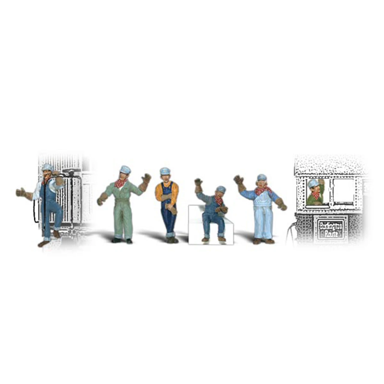 A set of men in bib overalls, work gloves and engineer hats. 6 pieces Complete your scene and bring it to life with affordable works of art in N scale. Sculpted in fine detail and hand-painted, they add color, humor and interest to any layout. Scenic Accents figures have a natural charm and a realistic appearance that steal the show! Economy packages also available in N scale. Attach with Scenic Accents Glue and position with Gentle Grips®.